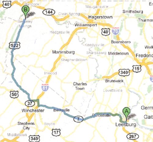 Take Route 7 toward Winchester. Get on I-81 North and take the NEXT EXIT. At the bottom of the ramp you will take a left and this will take you to 522 North. As you approach 522, bear right onto 522 North.Continue north on 522 towards Berkeley Springs. This part of the trip can take between 30 and 40 minutes.